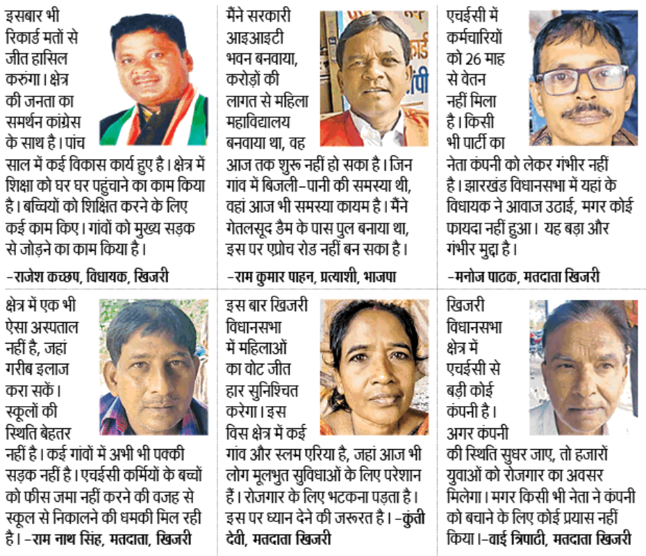 खिजरी क्षेत्र के मतदाता दोनों उम्मीदवारों के कार्यों की समीक्षा कर रहे हैं। विस्थापन की समस्या विकराल रूप लेती जा रही है। गेतरसूद डैम, सिकिदिरी हाइडल प्रोजेक्ट, रिंग रोड और एक्सप्रेसवे जैसी विकास योजनाओं पर काम शुरू होने के बाद क्षेत्र में विस्थापन बढ़ा है। हाथियों के आतंक, इससे जान-माल गंवाने के साथ फसल की बर्बादी का दंश भी ग्रामीण झेल रहे हैं। एशिया के सबसे बड़े भारी उद्योग एचईसी में करीब तीन हजार स्थायी-अस्थायी कर्मियों को 26 माह से वेतन नहीं मिल रहा है। यहां के कर्मचारियों की समस्या को किसी भी राजनीतिक दल ने गंभीरता से नहीं लिया है।