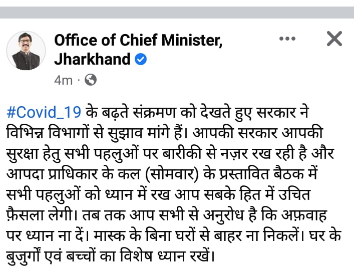 मुख्यमंत्री हेमंत सोरेन सोमवार को आपदा प्रबंधन प्राधिकार की बैठक करेंगे। इस दौरान प्रतिबंधों की घोषणा की जा सकती है। उन्होंने कहा है कि व्यापक हित को देखते हुए सरकार फैसला लेगी। मुख्यमंत्री कार्यालय (सीएमओ) ने ट्वीट कर जानकारी दी है कि कोरोना के बढ़ते संक्रमण को देखते हुए सरकार ने विभिन्न विभागों से सुझाव मांगे हैं। सरकार आम लोगों की सुरक्षा के लिए सभी पहलुओं पर बारीकी से नजर रख रही है और आपदा प्राधिकार की सोमवार को प्रस्तावित बैठक में सभी पहलुओं को ध्यान में रख सबके हित में फैसला लेगी। सरकार ने सभी से अनुरोध किया है कि अफवाह पर ध्यान न दें और मास्क के बगैर घर से बाहर नहीं निकलें। घर के बुजुर्गों और बच्चों का विशेष ध्यान रखने का आग्रह भी किया गया है।