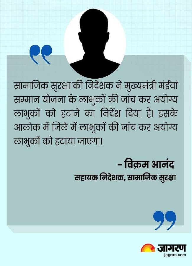 मुख्यमंत्री मंइयां सम्मान योजना के लाभुकों की जांच होगी। जांच के दौरान अगर कोई अयोग्य लाभुक पाया जाएगा तो उनका नाम योजना के लाभुकों की सूची से हटाया जाएगा। इस आशय का निदेशक महिला बाल विकास एवं सामाजिक सुरक्षा विभाग अंतर्गत सामाजिक सुरक्षा की निदेशक समीरा एस ने सभी उपायुक्त को दिया है।