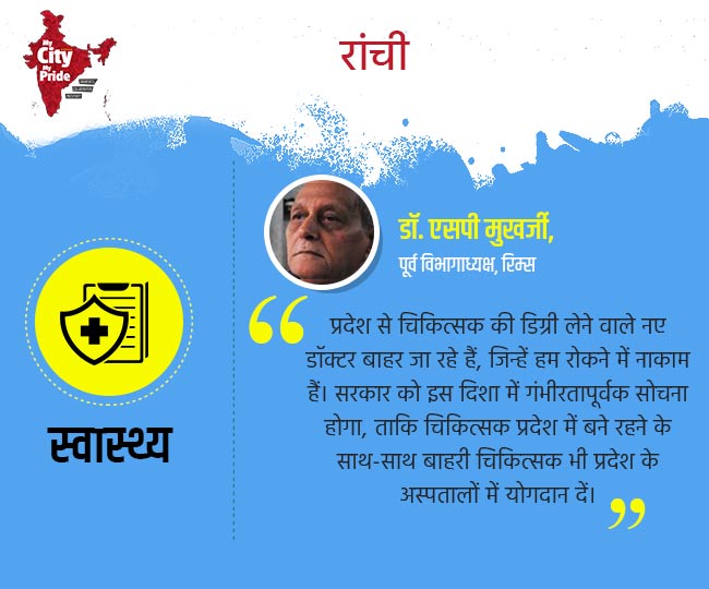 जमशेदपुर और धनबाद के मेडिकल कॉलेज में सिर्फ एमबीबीएस की पढ़ाई होती है, लेकिन अब तक पीजी के लिए मान्यता कॉलेज को नहीं मिल सकी है। साथ ही सदर अस्पताल को भी बड़े स्वरूप में उभारना होगा, ताकि मेडिकल कॉलेज पर कुछ हद तक दबाव कम हो सके। क्योंकि, रिम्स जैसे अस्पताल में रांची ही नहीं पूरे प्रदेश से मरीज आते हैं।"