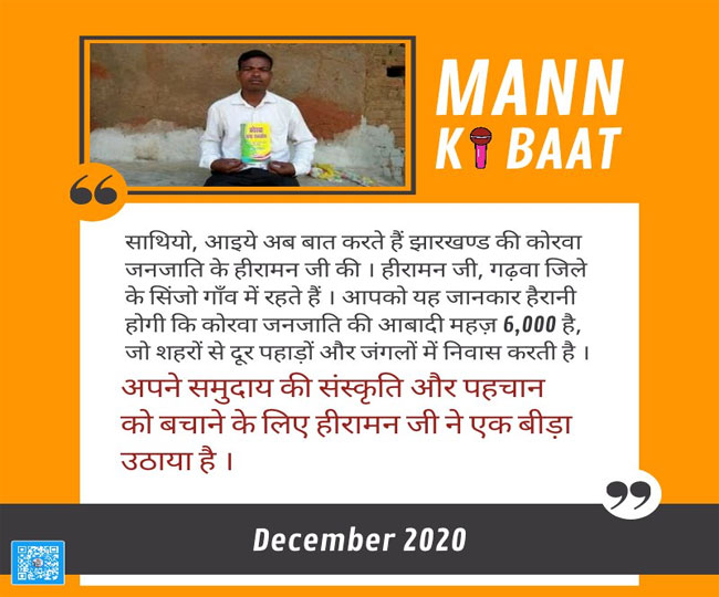 पीएम मोदी ने बताया कि कोरवा जनजाति की आबादी महज 6 हजार है। यह समुदाय शहरों से दूर पहाड़ों और जंगलों में निवास करती है। बता दें कि प्रधानमंत्री नरेंद्र माेदी के दूसरे कार्यकाल के दौरान का यह 19वां मन की बात है। आज 27 दिसंबर का मन की बात इस साल 2020 के आखिरी मन की बात थी। प्रधानमंत्री नरेंद्र मोदी महीने के आखिरी रविवार को मन की बात कार्यक्रम के माध्यम से आम जनता से जुड़ते हैं।