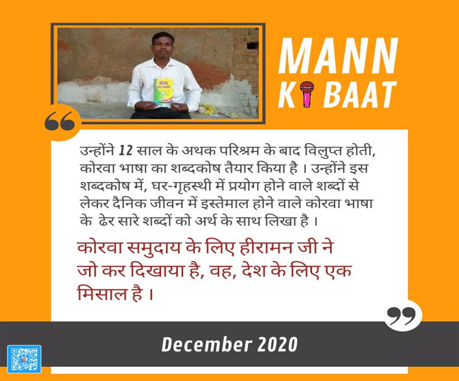 Mann Ki Baat हीरामण ने 12 सालों की अथक मेहनत के बाद कोरवा भाषा का शब्दकोश तैयार किया है। पीएम मोदी ने मन की बात में बताया कि हीरामण ने इस शब्दकोश में घर-गृहस्थ में प्रयोग होने वाले शब्दों को अर्थ के साथ लिखा है।