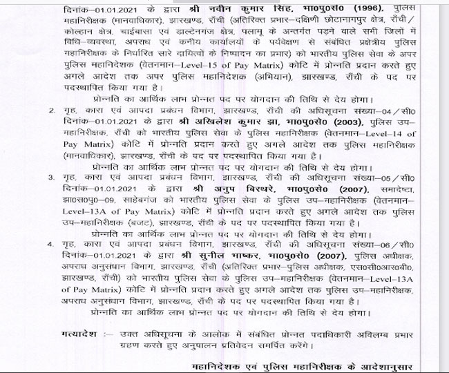 नवीन कुमार सिंह 1996 बैच के आइपीएस अधिकारी हैं, वहीं अखिलेश कुमार झा 2003 बैच के आइपीएस अधिकारी हैं। आइपीएस अनूप बिरथरे और सुनील भास्कर 2007 बैच के आइपीएस अधिकारी हैं। पिछले दिनों राज्य सरकार की प्रोन्नत समिति ने इन अधिकारियों को प्रोन्नत करने से संबंधित निर्णय लिया था। पुलिस मुख्यालय ने शुक्रवार की देर रात इससे संबंधित आदेश जारी कर दिया है। प्रोन्नत संबंधित सारे लाभ पदस्थापन के बाद से मिलेंगे। सभी नौ प्रोन्नति अधिकारियों को अविलंब अपने नए पद पर योगदान देने का आदेश दिया गया है।