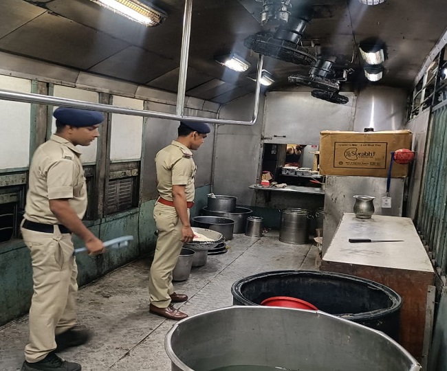 जम्मूतवी एक्सप्रेस के पेंट्रीकार में जांच करती आरपीएफ की टीम, ट्रेन में कैटरिंग वालों को गैस सिलेंडर रखने की मनाही है। इससे रेल हादसे की संभावना रहती है। इसे लेकर अभियान चलाया जा रहा है।
