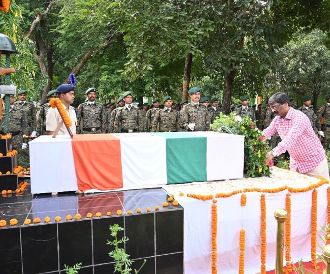 इस दौरान राज्यपाल सीपी राधाकृष्णन और मुख्यमंत्री हेमंत सोरेन ने शहीद जवान को पुष्प चक्र अर्पित कर श्रद्धांजलि दी।