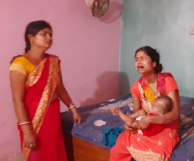 गोद मे अपने बच्चे के साथ बिलखती मृतक सागर की पत्नी।