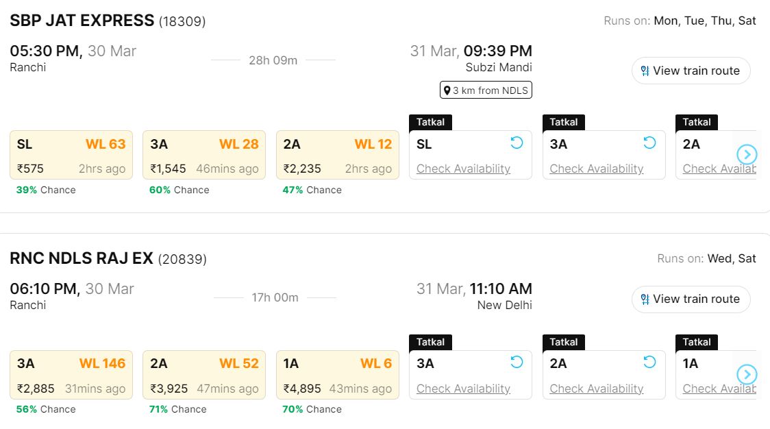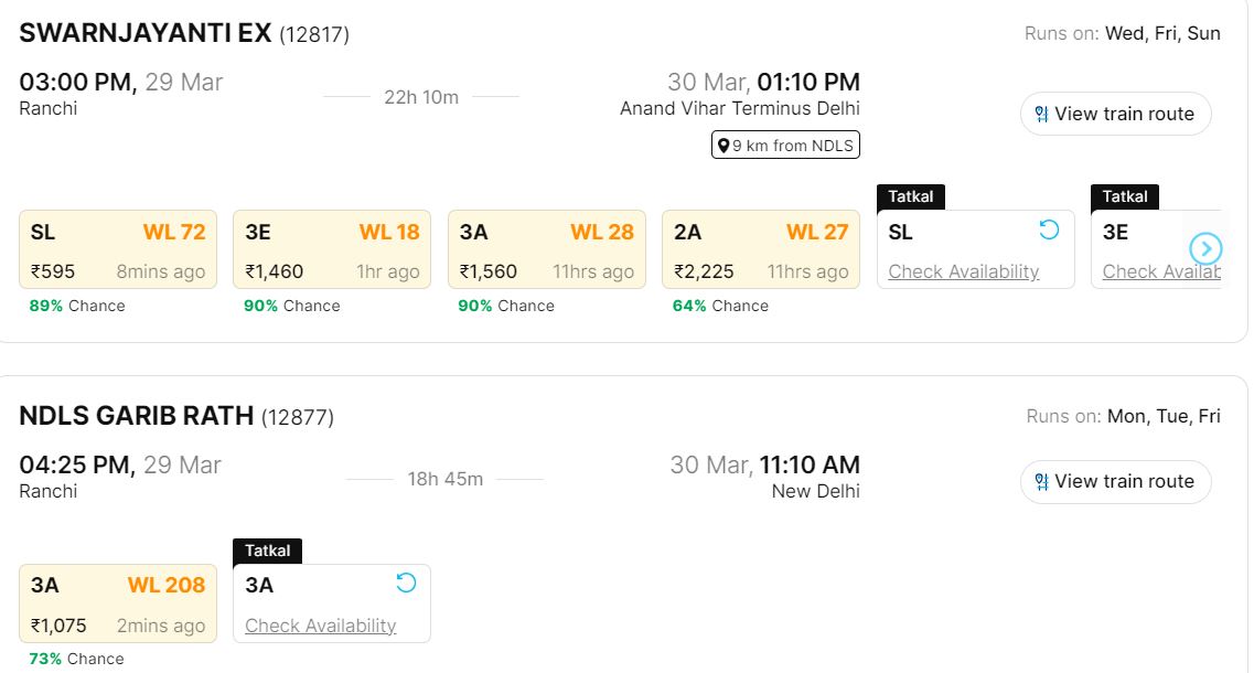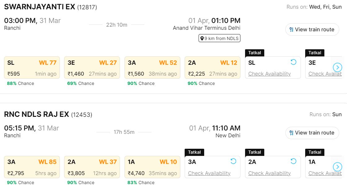 रांची से राष्ट्रीय राजधानी दिल्ली के लिए चलने वाली ट्रेनें सीमित संख्या में हैं इसलिए कंफर्म सीट मिलने में आपको थोड़ी मुश्किल आ सकती है। हम आपको 29 मार्च से 31 मार्च तक इन दो शहरों के बीच चलने वाली ट्रेनों में वेटिंग की ताजा स्थिति के बारे में बताने जा रहे हैं ताकि अपने या अपने परिवार के किसी सदस्य के लिए सीट बुक कराने में आपको कुछ सुविधा हो। यह जानकारी एक ऑनलाइन प्लेटफॉर्म से ली गई है।