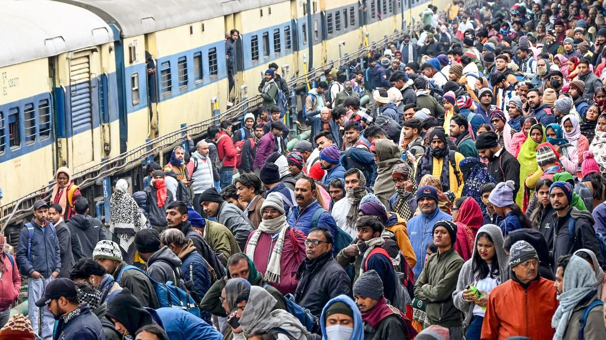 ट्रेन रद होने के बाद पटना रेलवे स्टेशन में भीड़। फोटो पीटीआई