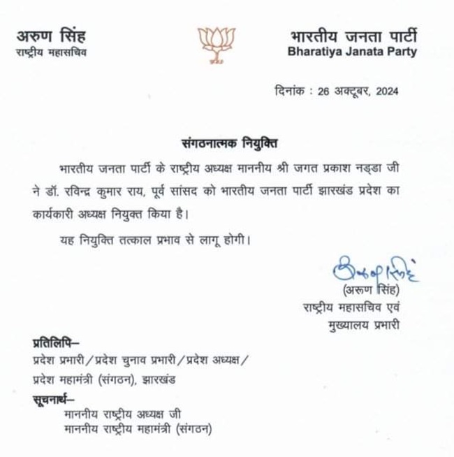 जागरण संवाददाता, रांची। Jharkhand News: झारखंड विधानसभा चुनाव से पहले भारतीय जनता पार्टी ने मास्टर स्ट्रोक खेल दिया है। बीजेपी ने डॉ. रविंद्र कुमार राय को बीजेपी झारखंड प्रदेश का कार्यकारी अध्यक्ष नियुक्त किया है। बता दें कि रविंद्र कुमार राय पूर्व में सांसद रहे हैं। बीते दिनों रविंद्र कुमार राय के जेएमएम में जाने की अफवाह भी उड़ी थी।