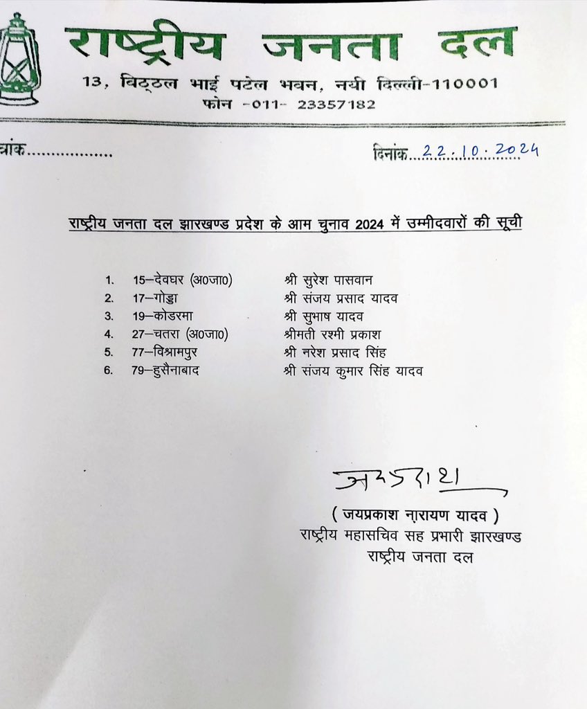 सीटों पर निर्णय के बाद राजद ने अपने प्रत्याशियों के नामों की घोषणा भी कर दी है। इनमें देवघर से सुरेश पासवान, गोड्डा से संजय प्रसाद यादव, कोडरमा से सुभाष यादव, चतरा से रश्मि प्रकाश, विश्रामपुर से नरेश प्रसाद सिंह व हुसैनाबाद सीट से संजय कुमार सिंह यादव को राजद ने अपना प्रत्याशी बनाया है।