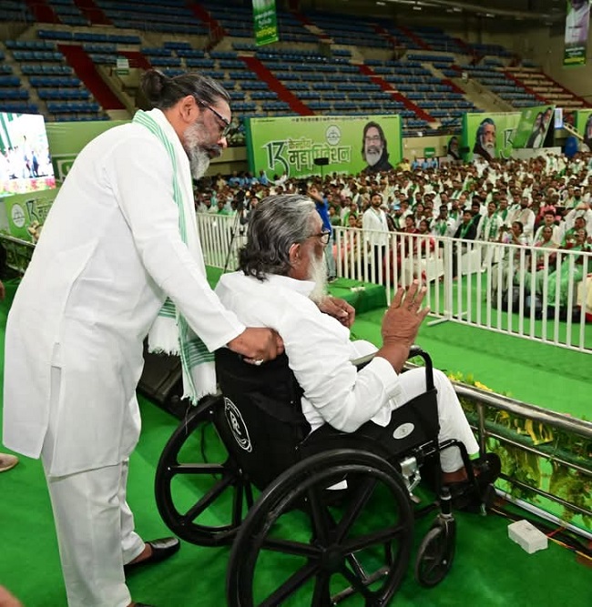 झारखंड मुक्ति मोर्चा की सभा में व्हील चेयर पर पहुंचे शिबू सोरेन।