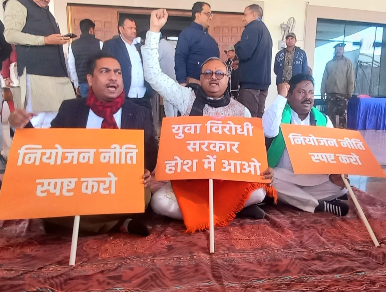 जासं, रांची। झारखंड विधानसभा के शीतकालीन सत्र का आज चौथा दिन है। इस दौरान विधानसभा के बाहर भाजपा के विधायकों ने हाथों में तख्तियां लेकर राज्य सरकार से नियोजन नीति बेरोजगारों के हित में लागू करने और महिलाओं पर अत्याचार किए दोषियों पर कार्रवाई सुनिश्चित करने की मांग की। विधायक मांगों से संबंधित तख्तियां लेकर धरने पर बैठै रहे।