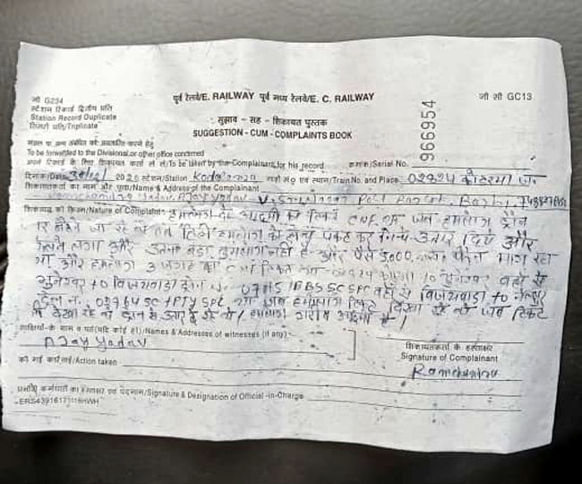 शिकायत करने वाले मजदूर रामचंद्र यादव और अजय यादव ने बताया कि दोनों विजयवाड़ा में पोकलेन ऑपरेटर का काम करते हैं। दोनों बरही के बरसोत के निवासी हैं। कोडरमा से भुवनेश्वर जाने के लिए बुधवार को ट्रेन में सवार हो रहे थे। इसके लिए उन्होंने ऑनलाइन टिकट बुक कराया था। कोडरमा स्टेशन प्रबंधक एके सिंह ने दोनों यात्रियों की शिकायत मिलने के बाद कार्रवाई के लिए धनबाद रेल मंडल के वरीय अधिकारियों के पास भेज दी थी।
