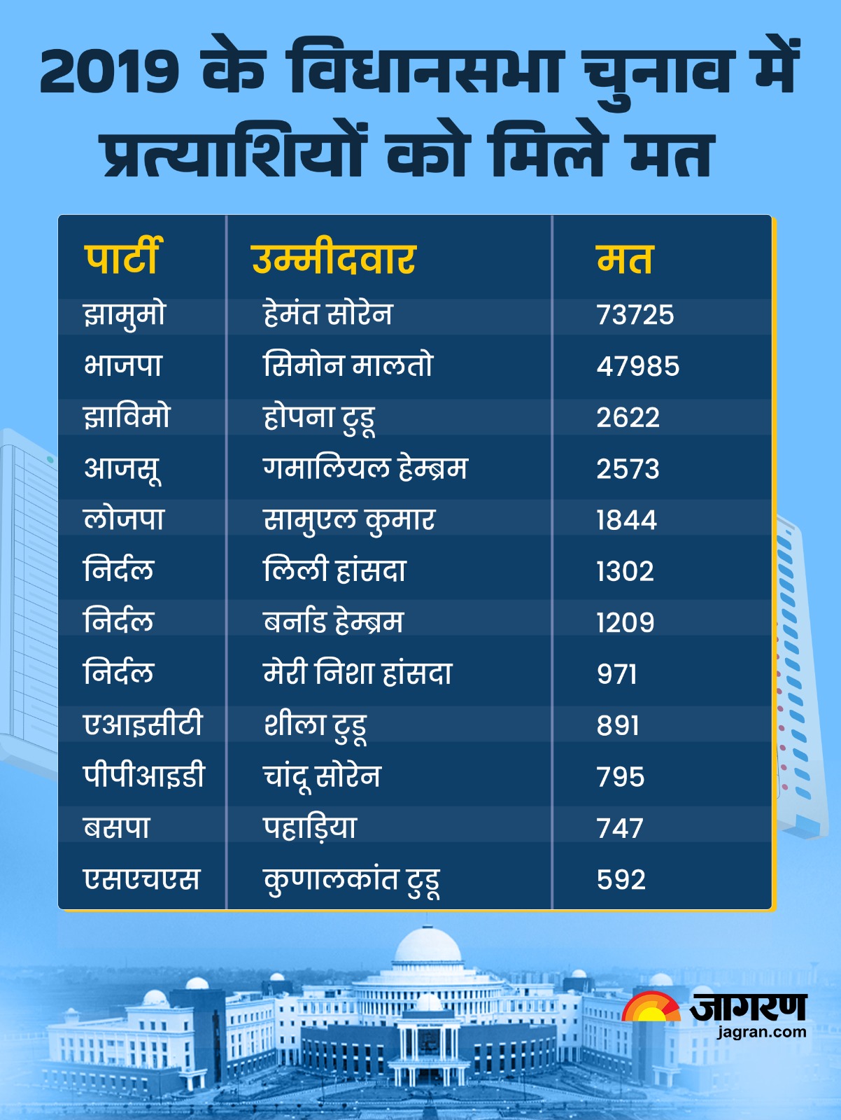 गत दो बार से हेमंत सोरेन यहां से चुनाव जीत रहे हैं। 1990 में हेमलाल मुर्मू ने कांग्रेस प्रत्याशी थामस हांसदा से यह सीट छीन ली थी। इसके बाद से इस विधानसभा सीट पर लगातार झामुमो का कब्जा है। 2005 तक हेमलाल यहां के विधायक रहे। 2004 में उनके सांसद बनने की वजह से झामुमो ने थामस सोरेन को यहां से टिकट दिया।