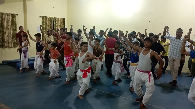 आचार्य छऊ नृत्य विचित्रा में छऊ नृत्य सीखते बच्चे।