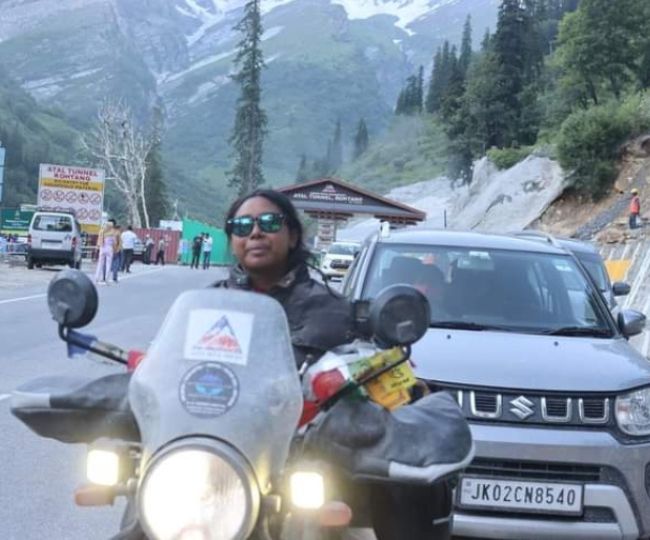 लद्दाख में बाइक चलाती कंचन उगुरसांडी।