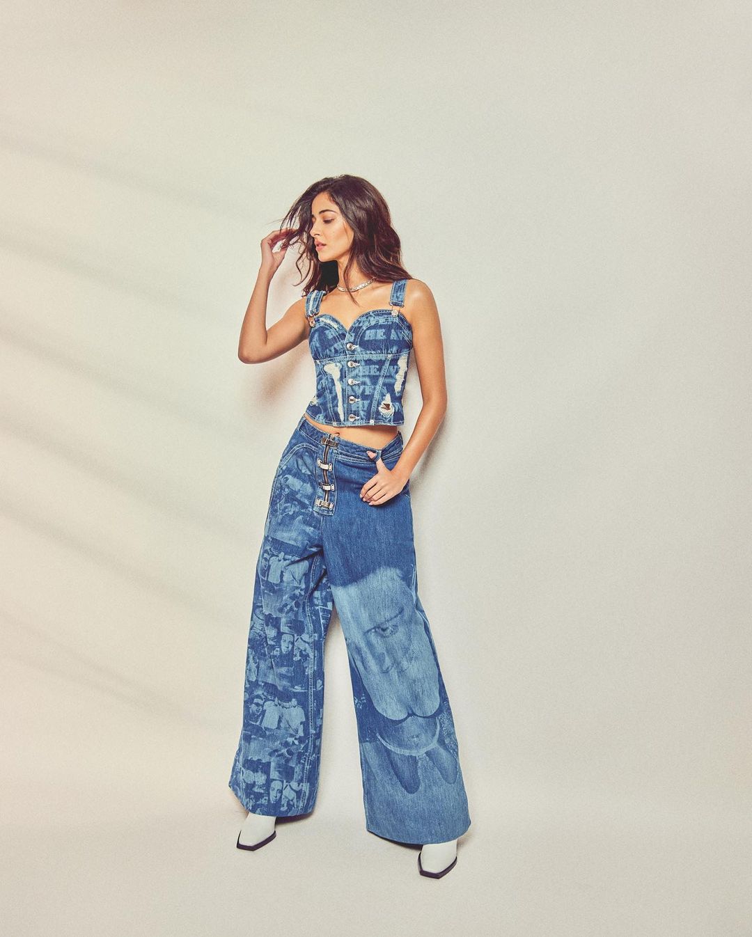 बात करें अनन्या के लुक की, तो उन्होंने डेनिम कॉर्सेट टॉप और डेनिम वाइड लेग पैंट पहन रखा है। टॉप में फ्रंट बटन और रिप्ड डिटेलिंग के साथ उसका स्वीटहार्ट नेकलाइन मुख्य आकर्षण है। वहीं, पैंट पर भी यूनीक प्रिंटिंग की गई है।