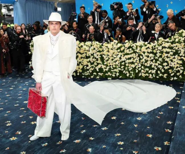नॉर्वे के अरबपति गुस्ताव विट्ज़ो रेड कार्पेट पर क्रीम रंग के सूट, लेटेक्स जैसे दिखने वाले ओवरकोट, चौड़े किनारे वाली टोपी और ताबी बूट्स में पहुंचे। कुल मिलाकर, यह पूरा पहनावा ऐसा लग रहा था जैसे इसे कुछ और फिटिंग की जरूरत हो। इसके अलावा, उन्होंने चमकीले लाल गुलाबों से भरा एक ट्रांसपेरेंट ब्रीफकेस भी ले रखा था, जिसने इस पूरे पहनावे को हाई-फैशन के पल से ज्यादा एक कॉस्ट्यूम जैसा बना दिया।