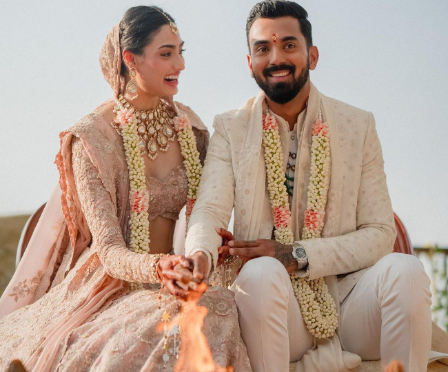 केएल राहुल (KL Rahul) ने मैचिंग पेस्टल और लाइट रंग को ही शेरवानी पहनी थी। वाइट और क्रीम कलर की शेरवानी में के एल राहुल काफी हैंडसम लग रहे थे। शेरवानी के साथ दुपट्टा और फुटवेयर में मैचिंग मोजड़ी पहनी। गले में हरे रंग के मोतियों का हार उनका लुक कंप्लीट कर रहा था।