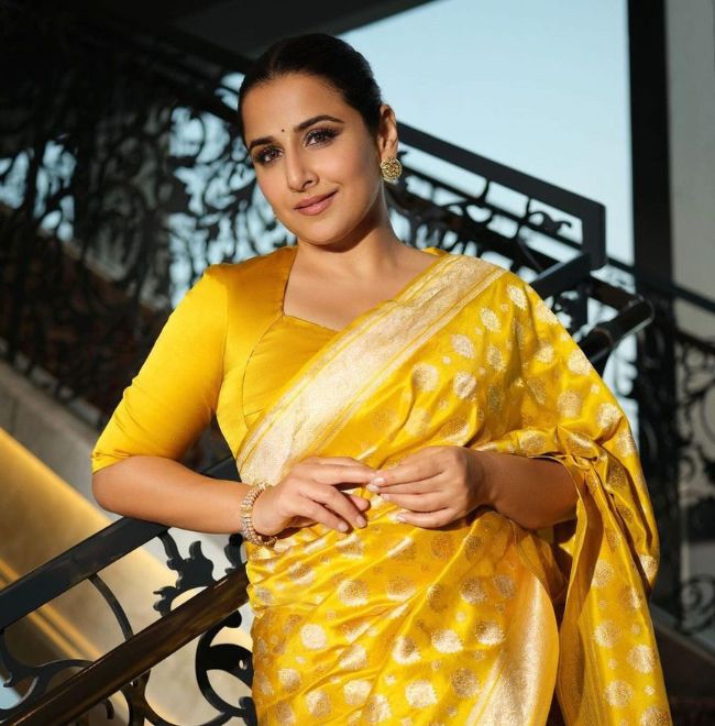 इस साल वंसत पंचमी पर एक बोल्ड और एलिगेंट लुक क्रिएट करने के लिए बॉलीवुड एक्ट्रेस विद्या बालन के इस लुक से प्रेरणा ले सकते हैं। पीले रंग की साड़ी पर गोल्डन बॉर्डर वाली इस साड़ी में वे बेहद खूबसूरत दिख रही थीं।आप भी अपने लुक को खास बनाने के लिए पीले रंग की साड़ी के साथ स्मोकी आई मेकअप कर सकती हैं। इससे आपका लुक काफी बोल्ड और खूबसूरत लगेगा।