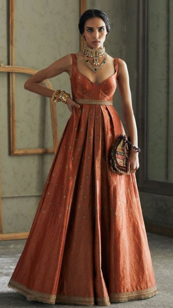 अगर आप ब्राइड हैं और रिसेप्शन पार्टी में पहने जाने वाले आउटफिट में मॉर्डन के साथ थोड़ा ट्रेडिशनल टच भी चाहती हैं, तो ब्रोकेड अनारकली का ऑप्शन रहेगा परफेक्ट। इस ड्रेस के साथ आपको बहुत हैवी ज्यूलरी कैरी करने की भी नहीं जरूरत। नेकलेस या हैवी झुमके हैं काफी लुक को पूरा करने के लिए।