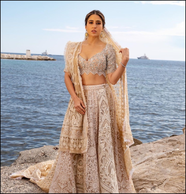 कान फिल्म फेस्टिवल में अपना डेब्यू करते हुए बॉलीवुड अभिनेत्री सारा अली खान ने विदेशी धरती पर भारतीय संस्कृति की झलक दिखाई। समारोह के पहले दिन एक्ट्रेस अबू जानी का डिजाइन किया हुआ आइवरी क्रीम कलर का लहंगा पहने नजर आईं। इसके अलावा सारा फेस्टिवल में ब्लैक कलर के हार्ट नेक शेप्ड लॉन्ग गाउन में भी बला की खूबसूरत लगीं।