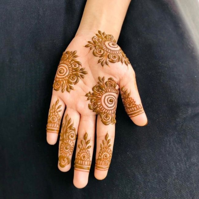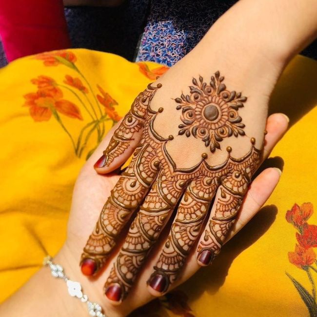 इस डिजाइन में आप अपनी उंगलियों पर अपनी पसंद की आकृतियां बनाएं और हाथ के बीच में कोई छोटा-सा फूल बनाएं। इससे ऐसा लगेगा कि आपने अपने पूरे हाथों पर मेहंदी लगाई है, वह भी खूब भर कर।