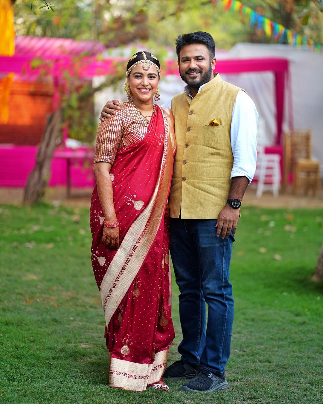 संगीत सेरेमनी के दिन स्वरा किसी साउथ इंडियन ब्राइड के रूप में सजी दिखाई दीं। उन्होंने लाल रंग की बनारसी सिल्क साड़ी के साथ कानों में ईयरिंग्स, माथा पट्टी और नाक में छोटी नथ को पहन रखा है। बालों में सफेद मोंगरे के गजरे को सजाकर स्वरा काफी खूबसूरत दिख रही हैं।