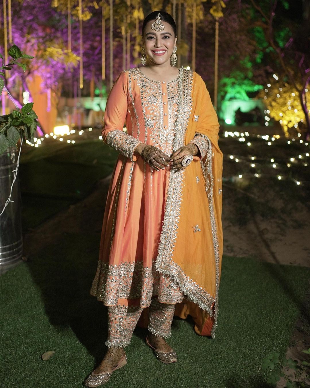एक्ट्रेस ने मेहंदी सेरेमनी के लिए किसी लहंगे और गाउन को छोड़ नारंगी रंग के सलवार सूट को चुना। गोटा पट्टी वर्क से भरे इस सूट को स्वरा ने झुमका, मांगटीका, हेवी रिंग और बालों में गजरे के साथ स्टाइल किया है।