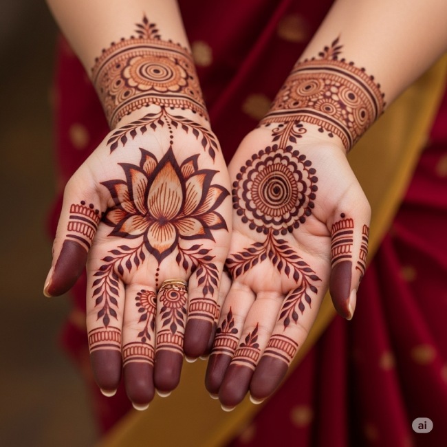 अगर आप तीज के लिए मेहंदी डिजाइन तलाश रही हैं, तो हाथों में बीच फूल वाली ये डिजाइन आपके लिए बिल्कुल परफेक्ट रहेगा। हाथों में बीचों-बीच फूल और उसके आसपास बनी बेल-बूटी आपके हाथों की खूबसूरती में चार चांद लगा देंगी। इस डिजाइन को लगाना बेहद आसान है और यह झटपट बन जाती है।