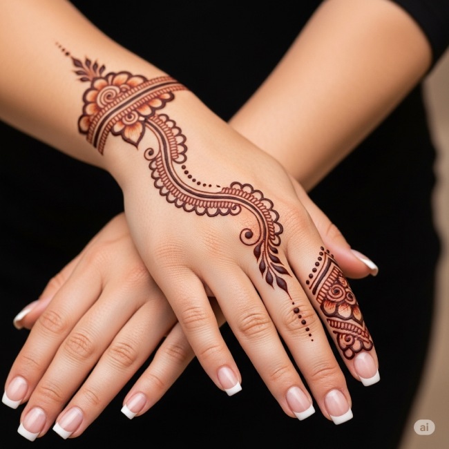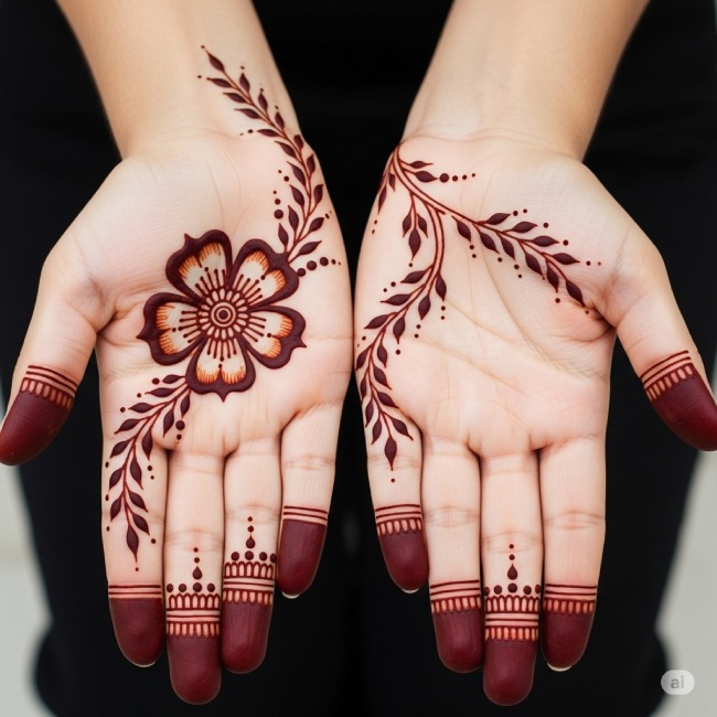 अगर आप एक वर्किंग वुमन हैं और शुभन की मेहंदी लगाने के लिए कोई सिंपल और डिसेंट डिजाइन खोज रही हैं, तो यह डिजाइन आपके लिए बिल्कुल सही है। बेहद सादगी भरी यह डिजाइन आपके हाथों को खूबसूरत तो बनाएगी ही, साथ ही ऑफिस के लिए भी यह परफेक्ट रहेगी और हर तरह के आउटफिट के साथ मेल खाएगी।
