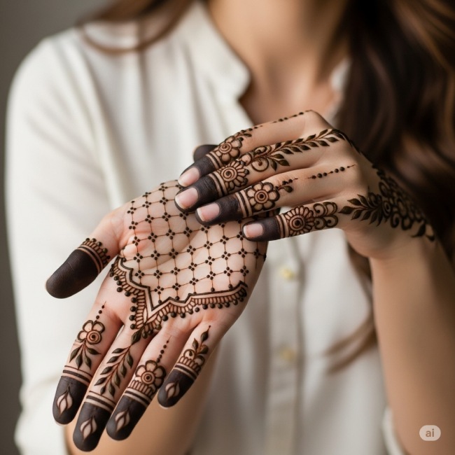 अगर आप इन दिनों ट्रेंड में चल रही मिनिमल मेहंदी डिजाइन की तलाश कर रही हैं, तो इसे जरूर ट्राई करें। हथेली पर चेक्स वाली डिजाइन दिखने में बेहद सुंदर और क्लासी लगती है। साथ ही इसे लगाना भी बेहद आसान होता है। इस मेहंदी डिजाइन को लगाने के बाद हर कोई आपकी तरीफ करता नजर आएगा।