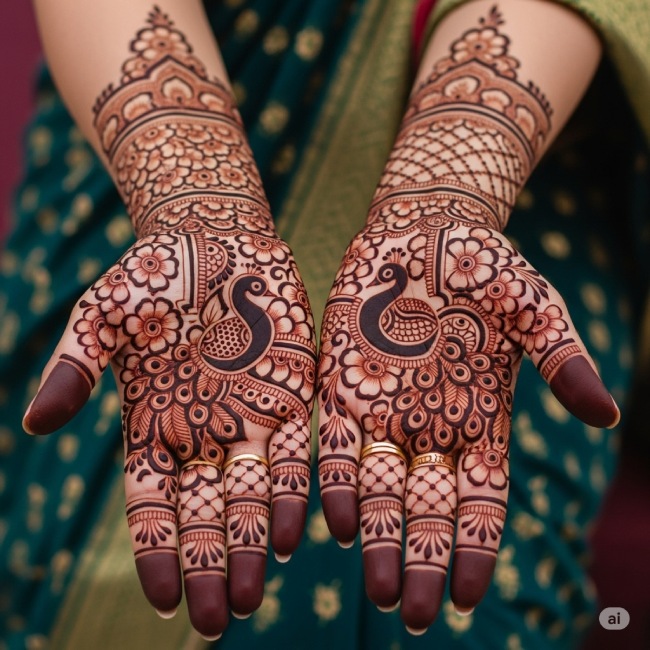 तीज के मौके पर आप ट्रेडिशनल भरमा मेहंदी डिजाइन भी ट्राई कर सकती हैं। इसे लगाना थोड़ा से मुश्किल और टाइम टेकिंग होता है, लेकिन अगर आप फुल फेस्टिव वाइव्स पाना चाहती हैं, तो इस डिजाइन को जरूर ट्राई करें। फूल, मोर, पत्ती और बूटों को मिलाकर बनी यह मेहंदी डिजाइन आपको खूबसूरत लुक देगी।