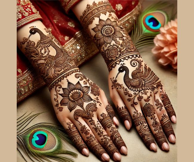 अगर आप होली के मौके पर एक क्लासिक और रॉयल लुक चाहती हैं, तो यह डिज़ाइन एकदम परफेक्ट है। इसमें मोर, कमल के फूल और अन्य पारंपरिक पैटर्न को बड़ी खूबसूरती से उकेरा जाता है, जिससे यह हाथों पर बहुत ही आकर्षक लगता है।