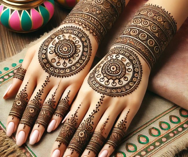 अगर आप इस होली पर कुछ ट्रेडिशनल और कलात्मक ट्राई करना चाहती हैं, तो रंगोली इंस्पायर्ड मेहंदी डिजाइन आपके लिए बेस्ट चॉइस होगी। यह डिजाइन देखने में जितनी खूबसूरत लगती है, उतनी ही आसान और फास्ट बनती भी है। इसमें गोलाकार रंगोली पैटर्न, ज्योमेट्रिक डिजाइन और फूल-पत्तियों की डिटेलिंग होती है, जो इसे अलग लुक देती है।