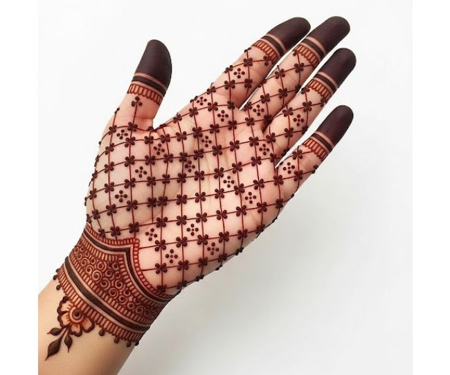 अगर आपको थोड़ी ज्यादा भरी हुई मेहंदी चाहिए, लेकिन आसान तरीका ढूंढ रही हैं, तो नेट डिजाइन आजमा सकती हैं। इसमें आप हथेली पर हल्के-हल्के जाल बना सकती हैं। खास बात है कि यह मेहंदी डिजाइन आपके हाथों को भरा-भरा दिखाता है, लेकिन इसे बनाना काफी आसान होता है। इसके अलावा, आप नेट के बीच में छोटे-छोटे फूल या डॉट्स भी जोड़ सकती हैं।