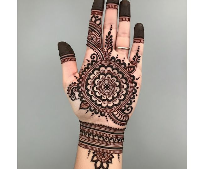 यह एक बहुत ही ट्रेडिशनल और सुंदर मेहंदी डिजाइन है। आप अपनी हथेली के बीच में एक बड़ा गोला बना सकती हैं और उसके चारों ओर अलग-अलग पैटर्न बना सकती हैं। यह डिजाइन आपके हाथों पर बहुत यूनिक और अट्रैक्टिव लगेगा और इसे बनाना भी काफी आसान है।