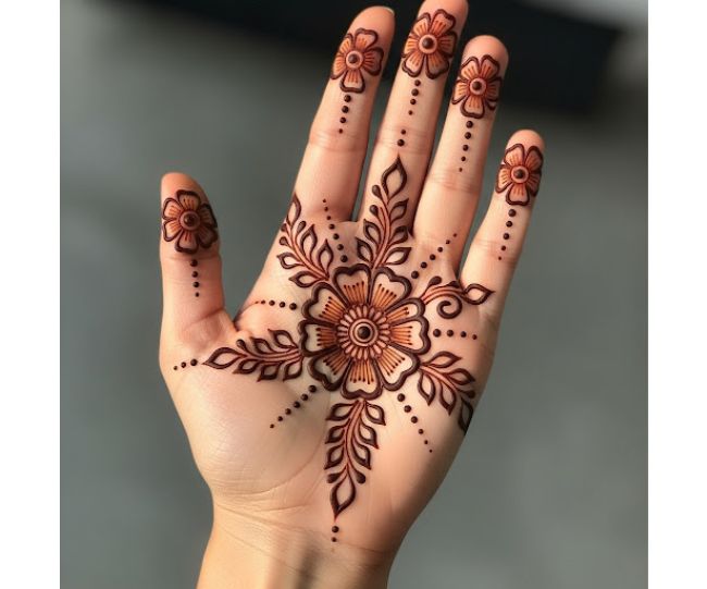 यह मेहंदी डिजाइन सबसे बेस्ट और आसान होता है। इसमें आप हथेली के बीच में एक बड़ा फूल बना सकती हैं और उसके चारों ओर पत्तियां या छोटे डॉट्स से सजा सकती हैं। उंगलियों पर भी आप ऐसे ही छोटे-छोटे फूल बना सकती हैं। सिर्फ इतना ही नहीं, यह डिजाइन दिखने में बहुत प्यारा लगता है और इसे बनाने में ज्यादा समय खर्च नहीं होता है।