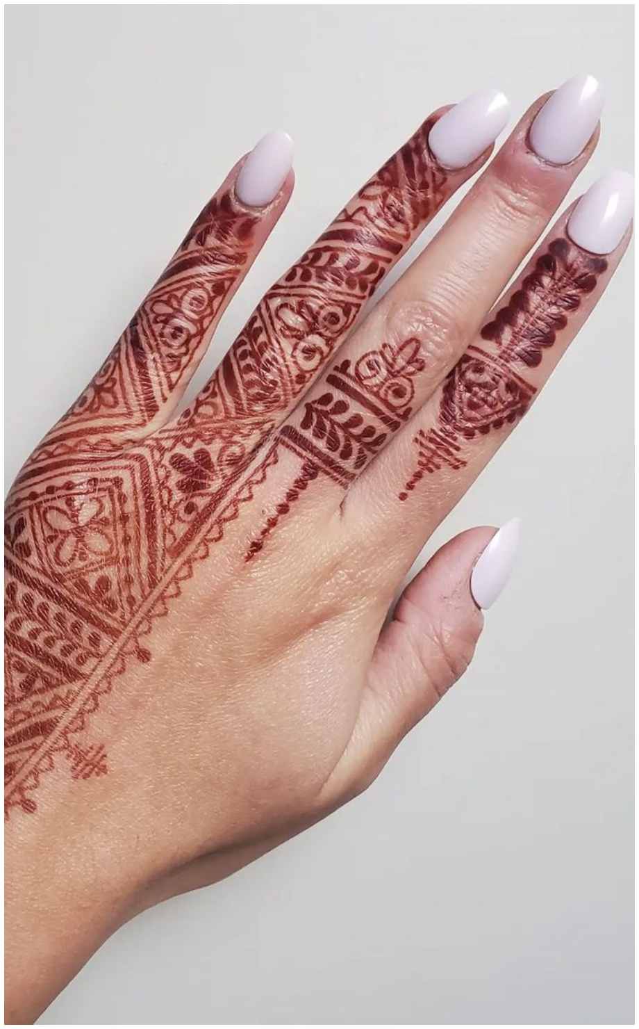 अगर आपको मेहंदी से भरे हाथ नहीं पसंद आते, तो आप मिनिमलिस्ट डिज़ाइन भी ट्राई कर सकती हैं। इसे बनाने में भी समय नहीं लगता।