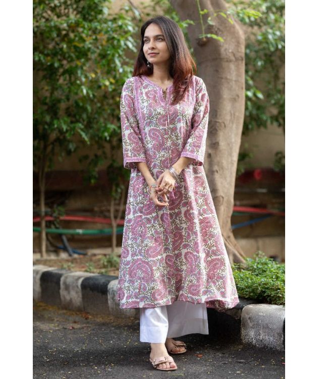 यह कुर्ता कमर से थोड़ा ढीला होकर नीचे की ओर 'A' शेप में खुलता है। यह हर बॉडी टाइप पर सूट करता है और इसमें मूवमेंट में आसानी होती है।