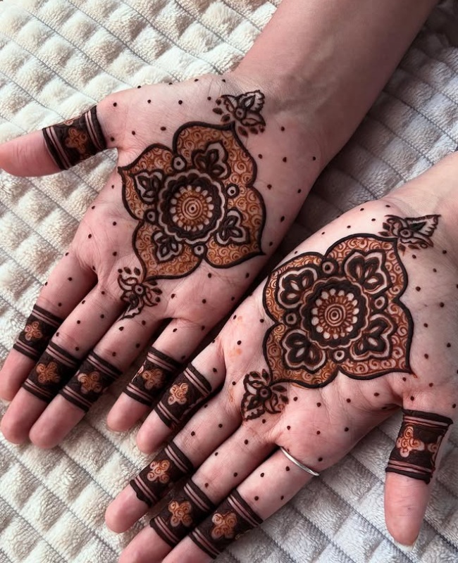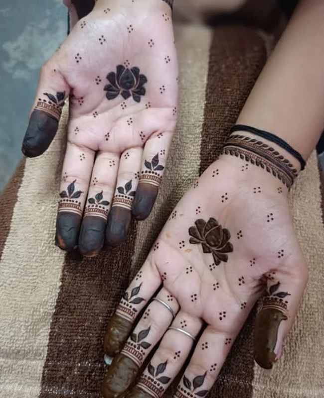 अगर आप कुछ सिंपल और क्लासी तलाश रही हैं, तो मेहंदी की ये डिजाइन ट्राई कर सकती हैं। हाथों के बीच कमल का एक फूल और आसपास डॉट्स के डिजाइन आपके हाथों को बेहद खूबसूरत बनाएंगे। साथ ही यह ईद और नवरात्र के मौके के लिए भी परफेक्ट हैं। सबसे अच्छी बात यह है कि इसे लगाना बेहद आसान है।