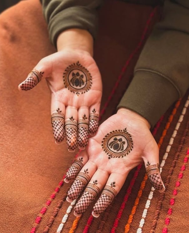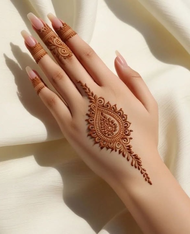 अगर आप एक वर्किंग वुमन हैं और आने वाले फेस्टिव सीजन के लिए कोई आसान और खूबसूरत मेहंदी डिजाइन तलाश रही हैं, तो ये डिजाइन जरूर ट्राई करें। हाथों के बीच गोले में बना फूल और आसपास मिनिमल डिजाइन आपकी खूबसूरती में चार चांद लगा देगी और हर कोई आपकी तारीफ करता नजर आएगा।