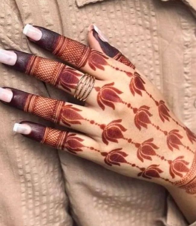 अगर आप बहुत हेवी डिजाइन नहीं लगाना चाहती हैं, तो ये डिजाइन आपके लिए एकदम परफेक्ट है। अपने हाथों पर छोटे-छोटे फूल बनाएं और उन्हें बिंदुओं से जोड़ते जाएं, ताकि वे एक लड़ी में गुंथे हुए लगें। उंगलियों के सिरों को मेहंदी से कवर करें और कलाई के बास बारीक लाइन से डिजाइन बनाएं। यह मेंहदी डिजाइन ट्रेडिशनल और मॉर्डन दोनों लुक देगी।