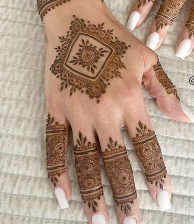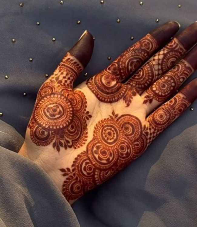 यह मेहंदी डिजाइन हर किसी को खूब पसंद आता है और खूबसूरत होने के साथ-साथ लगाने में भी काफी आसान है। दरअसल, इसके लिए आपको अपनी हथेली के बीच में एक गोल बिंदू बनाना है, जिसका साइज आप अपने हिसाब से चुन सकती हैं और इसके आस-पास बारीक छोटे-छोटे डिजाइन बनाएं। इस डिजाइन को बनाने में आपको 10-15 मिनट का समय लगेगा।