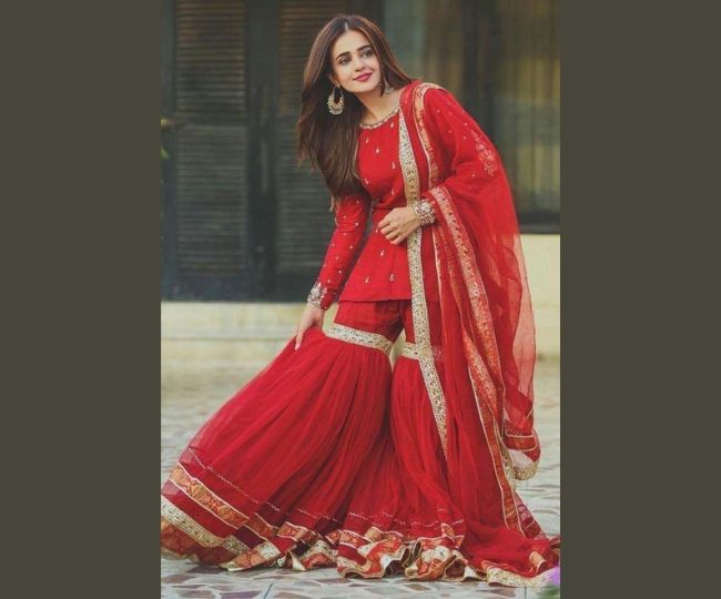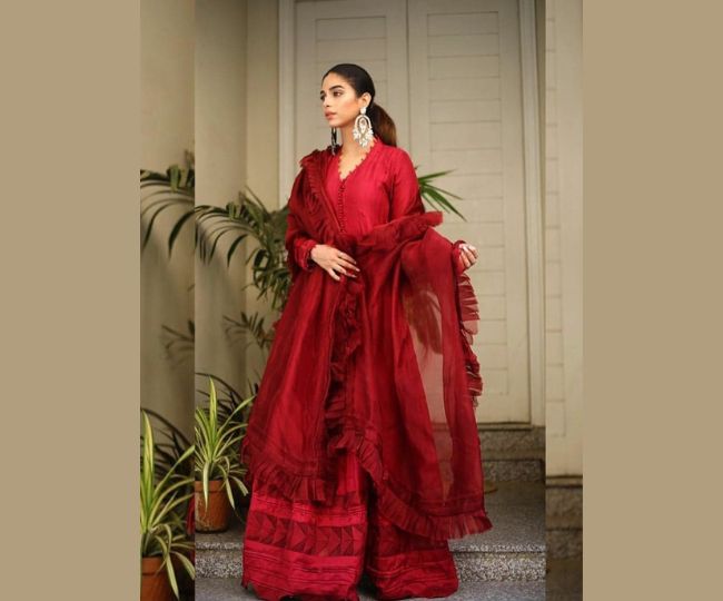 शरारा सेट इन दिनों फैशन की दुनिया में काफी ट्रेंड में है। ऐसे में, आप भी नवरात्र के छठे दिन इसके साथ एक अनोखा लुक क्रिएट कर सकती हैं। इस लाल रंग के शरारा सेट के साथ आप कंट्रास्टिंग या मिरर वर्क वाले दुपट्टे को कैरी करके अपने लुक को और भी ज्यादा खास बना सकती हैं।