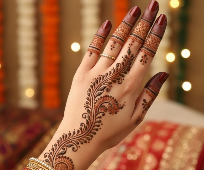 यह एक क्लासिक और पॉपुलर मेहंदी डिजाइन है। अपनी कलाई से शुरू करके, एक सीधी लाइन खींचें और उस पर छोटी-छोटी पत्तियां और बेल जैसा पैटर्न बनाएं। यह बेल डिजाइन उंगलियों तक जाता है और इसे आप आसानी से सिर्फ एक ही हाथ पर लगा सकती हैं।