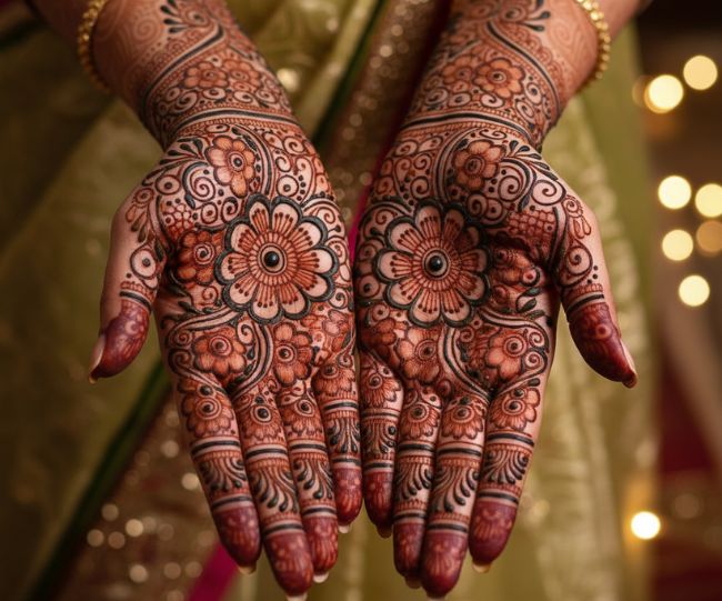 अगर आपको फूलों के मेहंदी डिजाइन पसंद हैं, तो यह आपके लिए है। अपनी हथेली के बीच में एक बड़ा फूल बनाएं। इसके लिए एक गोल सर्कल बनाएं और उसके चारों ओर पत्तियां बनाएं। अब इस फूल के चारों ओर कुछ छोटी पत्तियां और घुमावदार लाइनें बनाकर इसे सजाएं। यह डिजाइन पारंपरिक होने के साथ-साथ बहुत ही प्यारा भी लगता है।