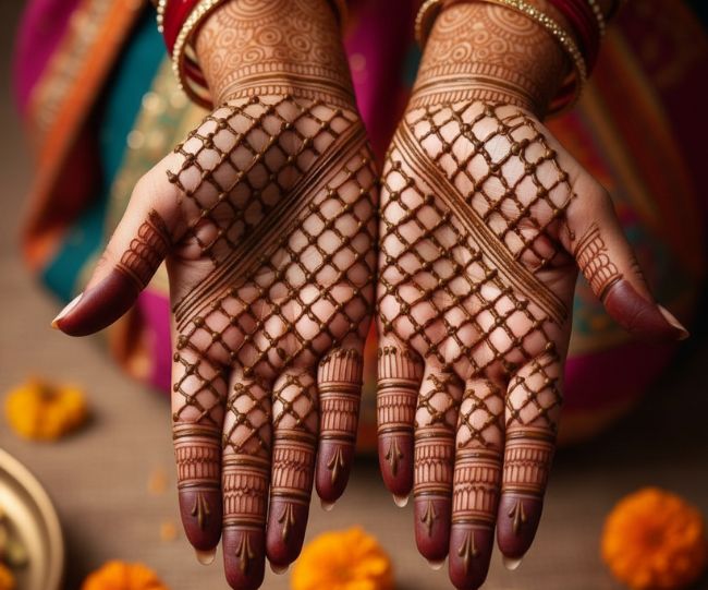 यह मेहंदी डिजाइन देखने में बहुत ही अट्रैक्टिव लगता है, लेकिन इसे बनाना काफी आसान है। हथेली के बीच से शुरू करके, एक तिरछी लाइन खींचें। फिर इस लाइन के समानांतर थोड़ी दूरी पर एक और लाइन खींचें। अब इसके विपरीत दिशा में भी यही प्रक्रिया दोहराएं। इससे एक जाली जैसा पैटर्न बन जाएगा। आप इसे उंगलियों पर भी बना सकती हैं।