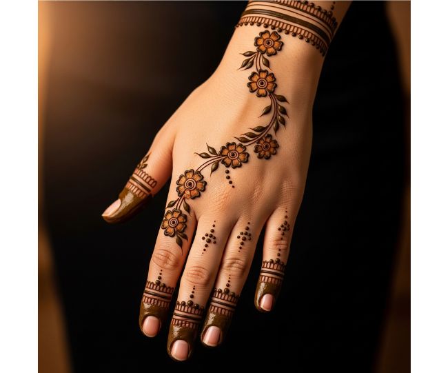 यह डिजाइन उन महिलाओं के लिए एकदम सही है जो सादगी पसंद करती हैं। इसमें आप हाथ के पिछले हिस्से पर एक पतली बेल या कुछ छोटे फूल बना सकती हैं। सिर्फ इतना ही नहीं, अगर आप चाहें तो अपनी उंगलियों पर भी छोटे-छोटे डॉट्स या पत्तियां बनाकर इसे और खूबसूरत बना सकती हैं। बता दें, यह डिजाइन दिखने में जितना सोबर लगता है, बनाने में उतना ही आसान है।