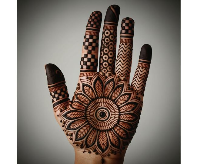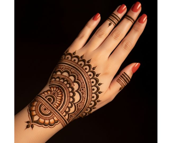 अगर आपको मंडला डिजाइन पसंद हैं लेकिन पूरा बनाने का समय नहीं है, तो हाफ-मंडला या सेमी-सर्कुलर डिजाइन चुनें। हाथ के एक कोने से शुरू करके एक सेमी-सर्कुलर पैटर्न बनाएं और उसे अंदर से फ्लोरल या जियोमेट्रिक पैटर्न से भर दें। यकीन मानिए, यह डिजाइन आपके हाथों को एक एलीगेंट लुक देगा और कोई भी इसकी तारीफ किए बिना खुद को रोक नहीं पाएगा।
